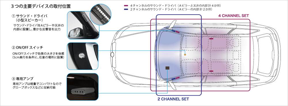 LAYERED SOUNDは、今までお使いのカーオーディオにプラスして使う全く新しい音響システムです。車内の内装材やAピラーの裏に取り付けるので、お気に入りの愛車のインテリアの雰囲気を壊してしまうことはありません。もちろん現在使用中のスピーカーを交換する必要もありません。